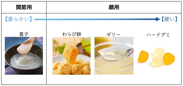 顔用のヒアルロン酸製剤は、ヒアルロン酸分子同士を繋ぎ合わせる架橋材が添加されることで、体内で分解・吸収してされにくくなっており、目的に応じて適度な弾性(硬さ、形の作りやすさ)、凝集性(馴染みやすさ)が備わっています。 よって一般的に関節用のものより硬く、わらび餅やゼリーのように柔らかいものから、ハードグミのように硬いものまでバラエティがありこれらを目的・部位によって使い分けます。
