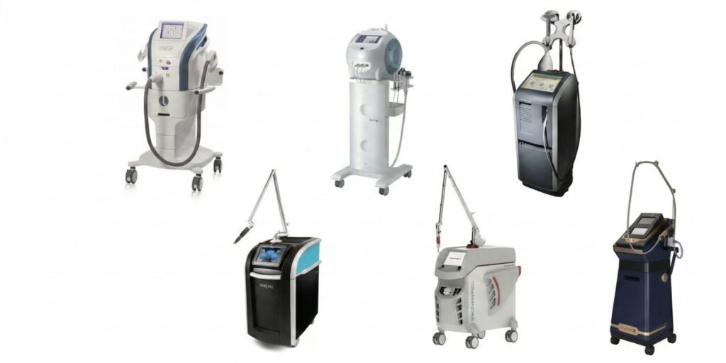 当院のカスタマイズ治療では、厚生労働省の薬事承認を取得した安全性の高い医療機器(ピコシュア、ディスカバリーピコプラス、M22、Xeo)も患者様のお肌の状態に合わせて組み合わせて使用しております。