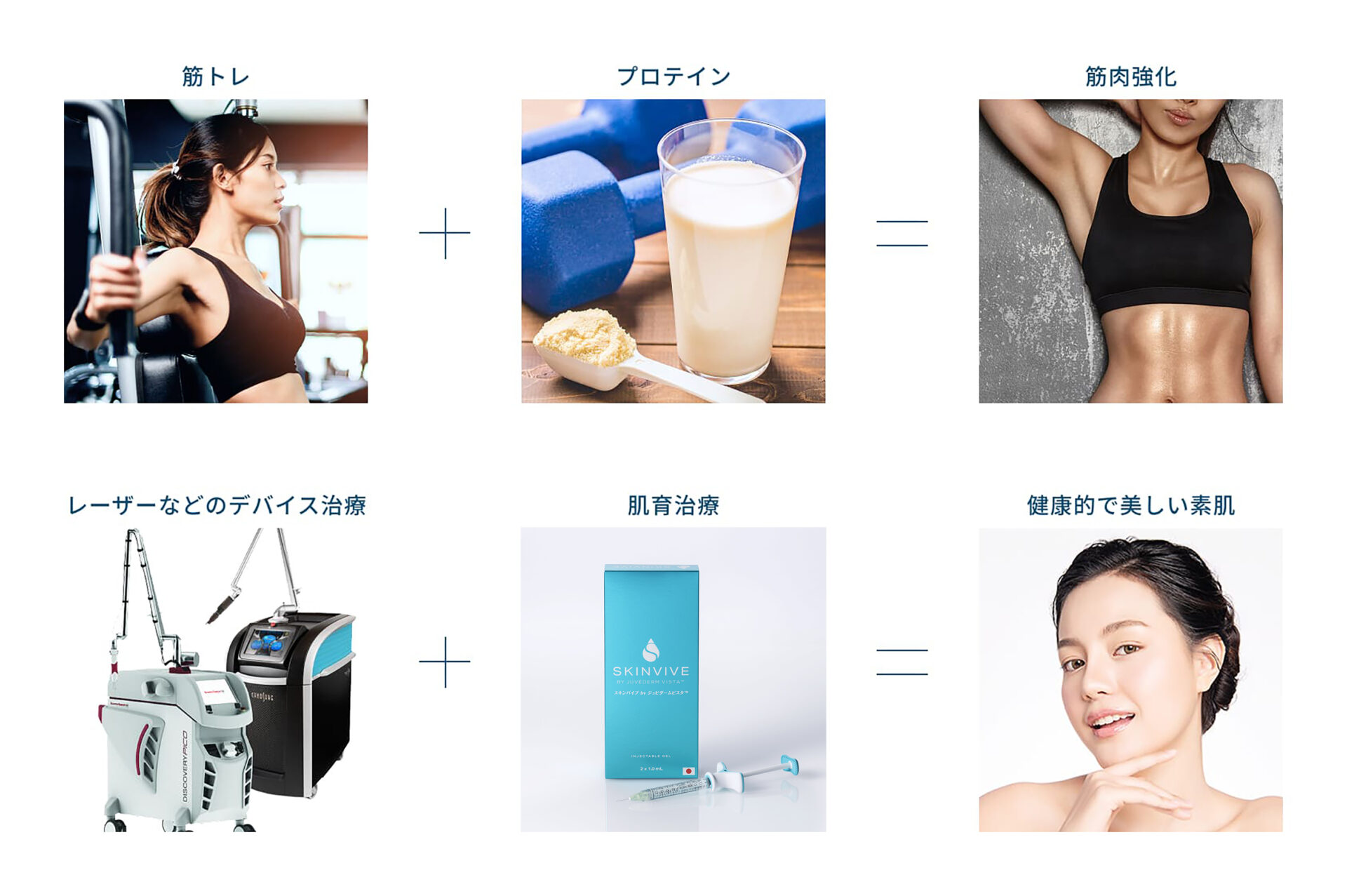いわば筋トレにおけるプロテイン。レーザー治療がトレーニングだとすると、そのトレーニング効果を最大限発揮するために欠かせないのがプロテイン=肌育治療なのです。他の治療との併用でより一層美しい肌を手に入れることができます。