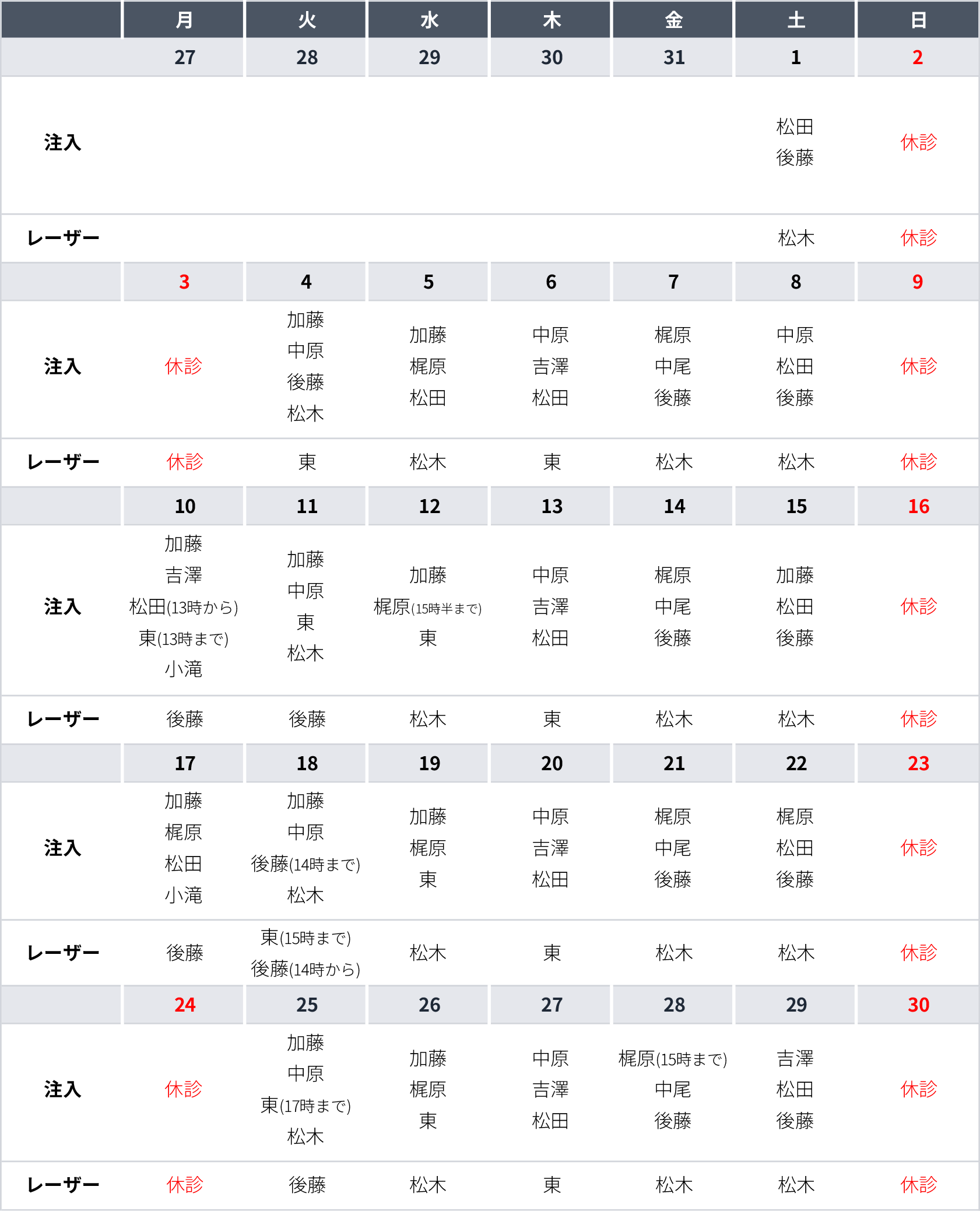 ※学会や研修などにより、診療日、担当医が変更になる可能性がございます。予めご了承くださいませ。