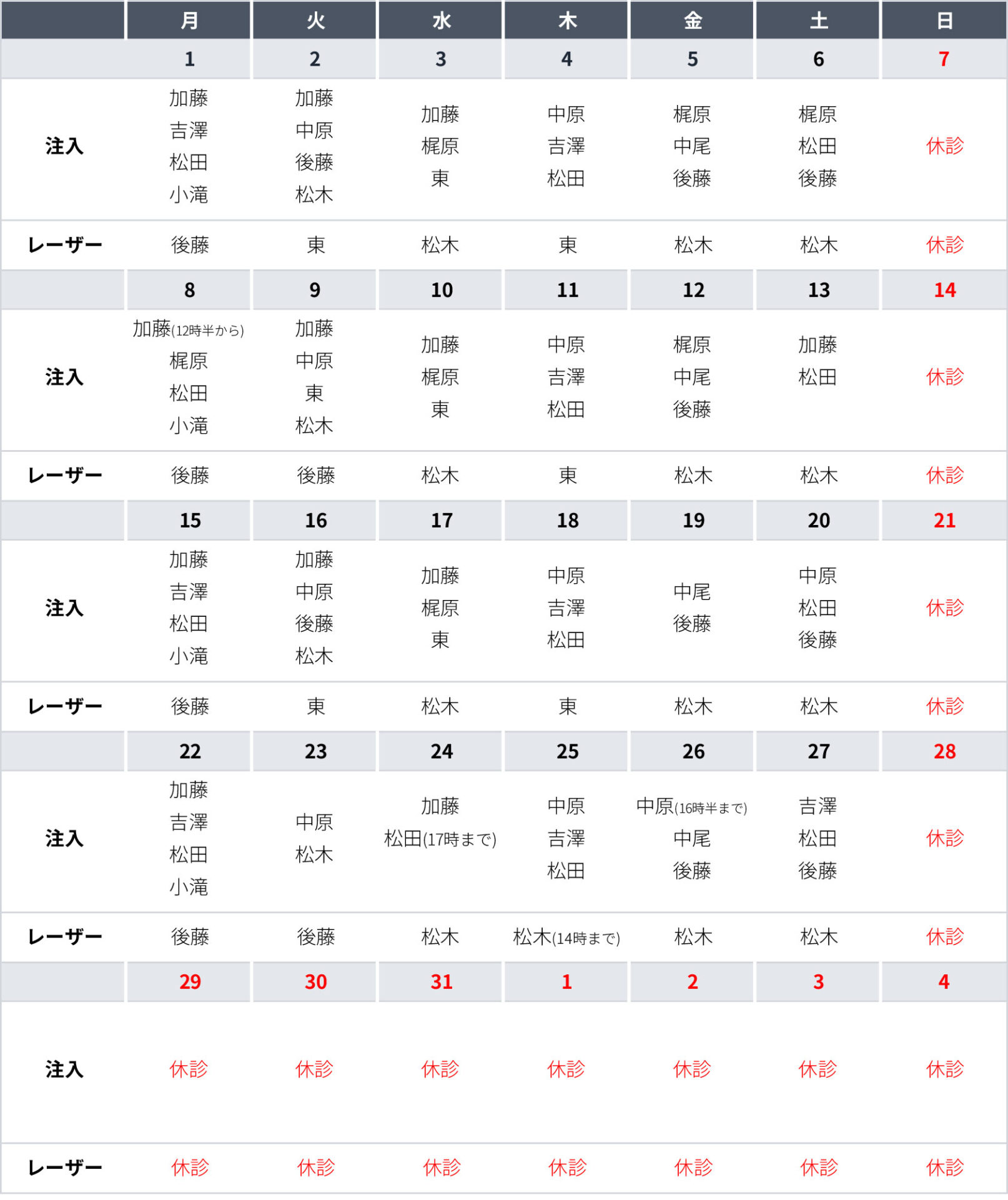 ※学会や研修などにより、診療日、担当医が変更になる可能性がございます。予めご了承くださいませ。